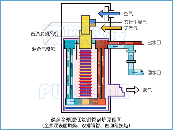 葆藍(lán)翅片銅管鍋爐四回程即使式換熱結(jié)構(gòu),燃燒室、次冷凝室、主冷凝室三室分離結(jié)構(gòu),壽命超長,導(dǎo)熱快,加熱精準(zhǔn)。